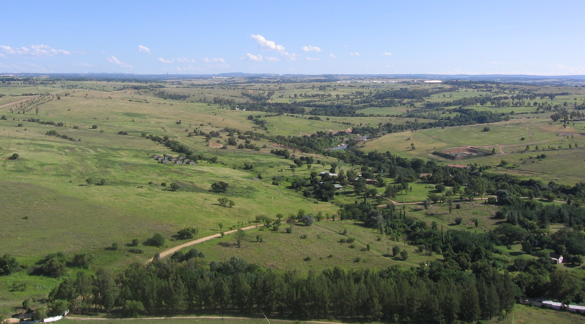 Fig. 6.3 Some features on a landscape are easy to represent as points, polylines and polygons (e.g. trees, roads, houses). In other cases it can be difficult. For example how would you represent the grasslands? As polygons? What about the variations in colour you can see in the grass? When you are trying to represent large areas with continuously changing values, raster data can be a better choice.