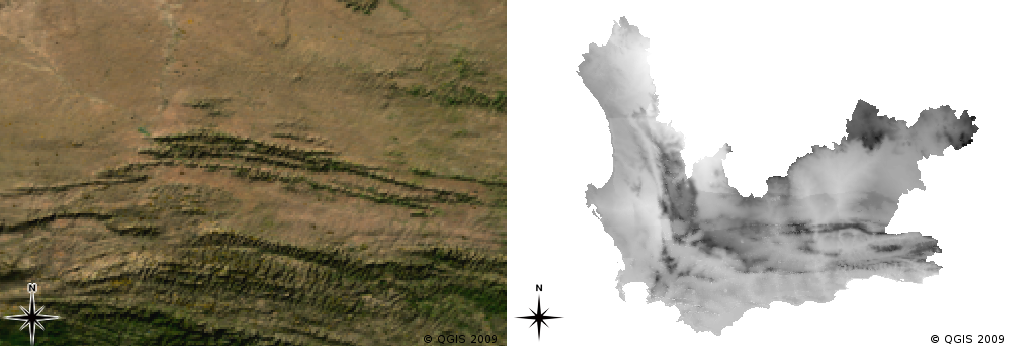 Fig. 6.4 True colour raster images (left) are useful as they provide a lot of detail that is hard to capture as vector features but easy to see when looking at the raster image. Raster data can also be non-photographic data such as the raster layer shown on the right which shows the calculated average minimum temperature in the Western Cape for the month of March.