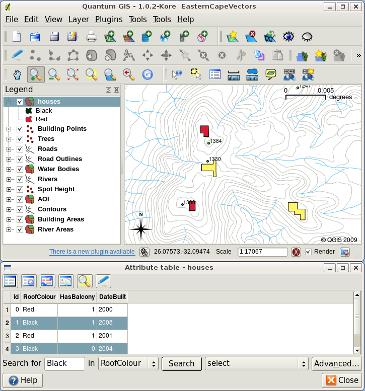 Fig. 4.8 A houses layer. House features have attributes that describe the houses’ roof colour and other properties. The attribute table (lower image) lists the attributes for the house areas shown on the map. When a feature is highlighted in the table, it will appear as a yellow polygon on the map.
