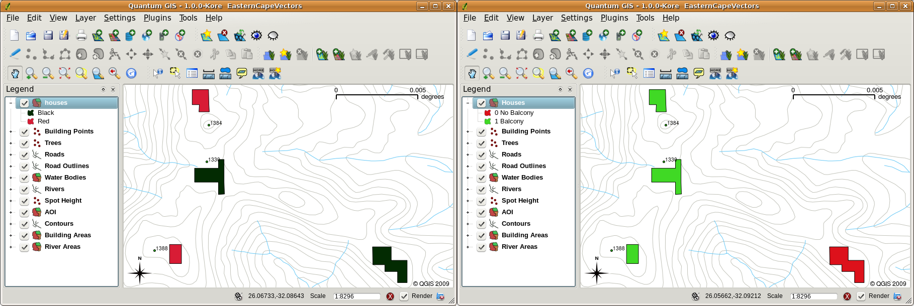 Fig. 4.9 In a GIS Application, we can draw features differently depending on their attributes. On the left we have drawn house polygons with the same colour as the roof attribute. On the right we colour coded houses according to whether they have a balcony or not.