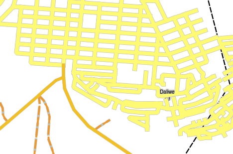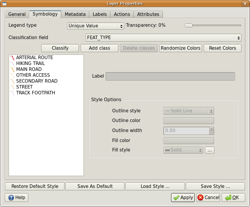 A GIS application will normally allow you to set the symbology of a layer using a dialog box such as the one shown in in Fig. 4.12. In this dialog box you can choose colours and symbol styles. Depending on the geometry type of a layer, different options may be shown. For example with point layers you can choose a marker style. With line and polygon layers there is no marker style option, but instead you can select a line style and colour such as dashed orange for gravel roads, solid orange for minor roads, and so on (as shown in Fig. 4.13). With polygon layers you also have the option of setting a fill style and color.