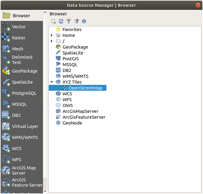 In the Browser tab, expand the XYZ Tiles drop-down menu and double-click the OpenStreetMap item.