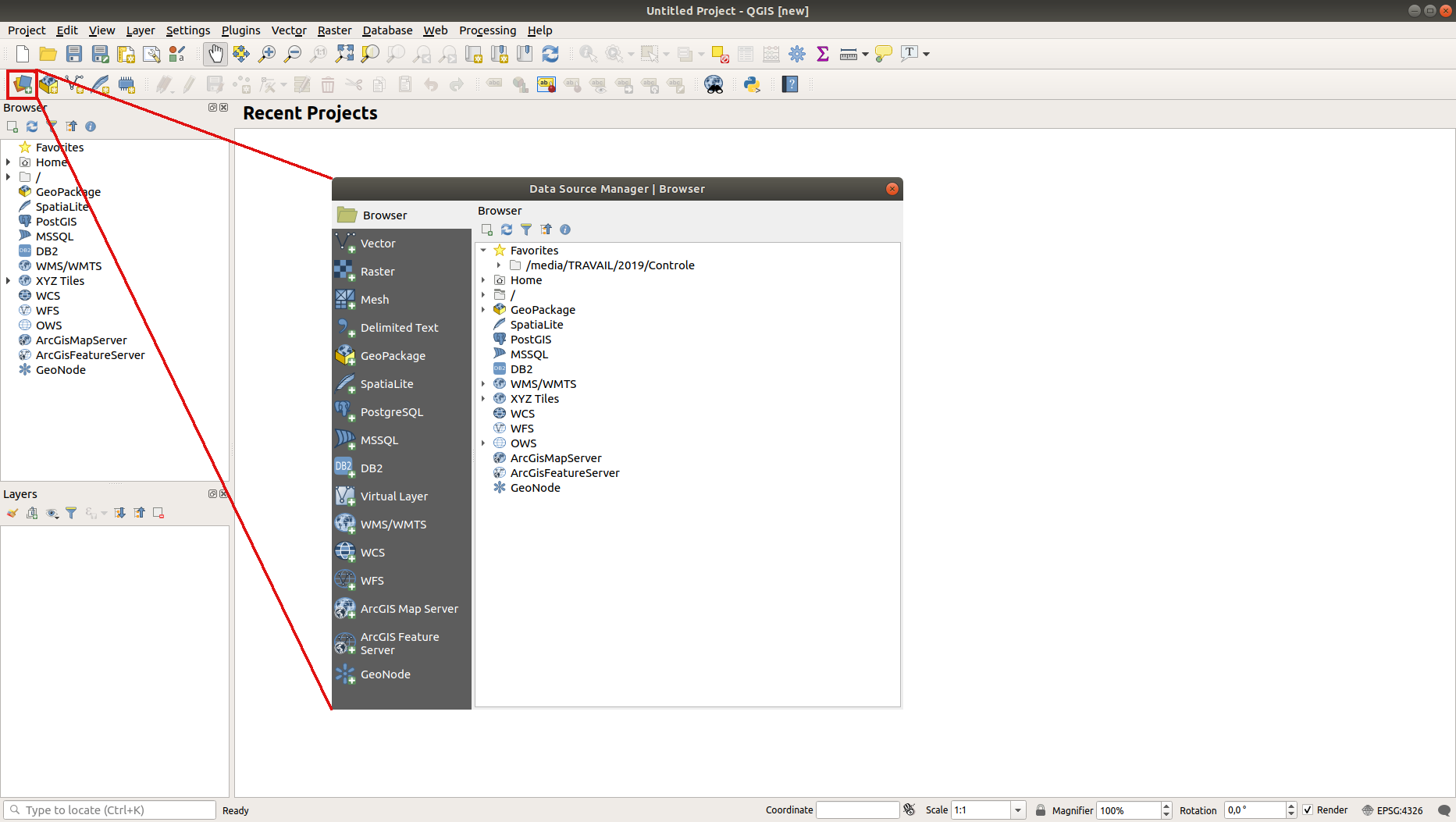 Open Data Source Manager button.If you can’t find the icon, check that the Data Source Manager toolbar is enabled in the menu.
