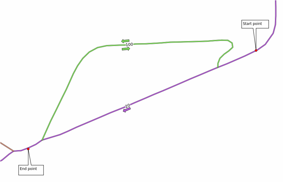 we would like to know the fastest route considering the speed limits of each road (the labels represent the speed limits in km/h). The shortest path without considering speed limits would of course be the purple path. But in that road the speed limit is 20 km/h, while in the green road you can go at 100 km/h!