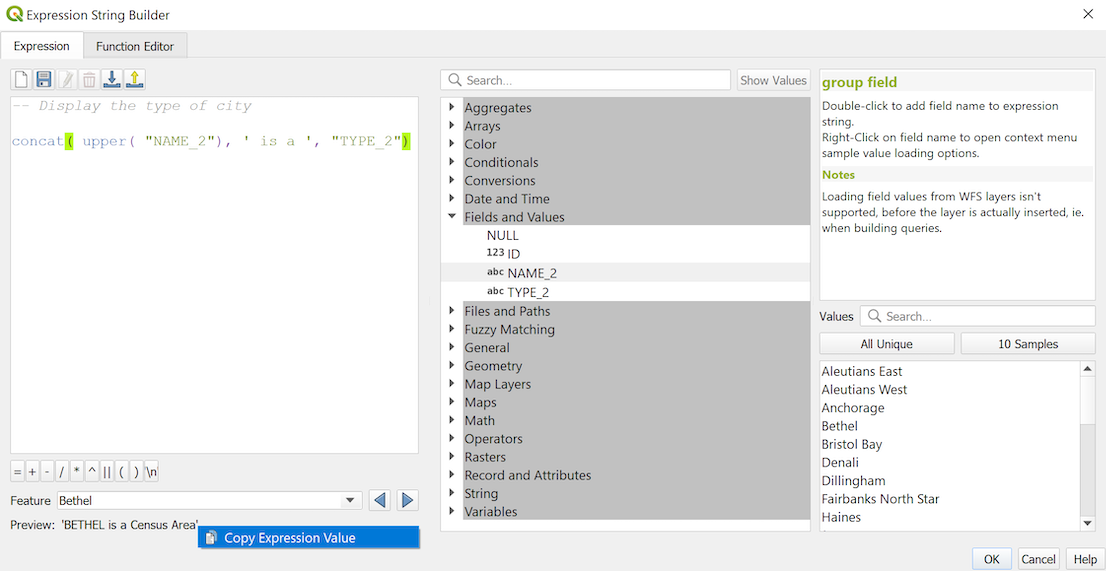 Copy Expression Value.You can browse and evaluate other features of the layer using the Feature combobox (the values are taken from the display name property of the layer).