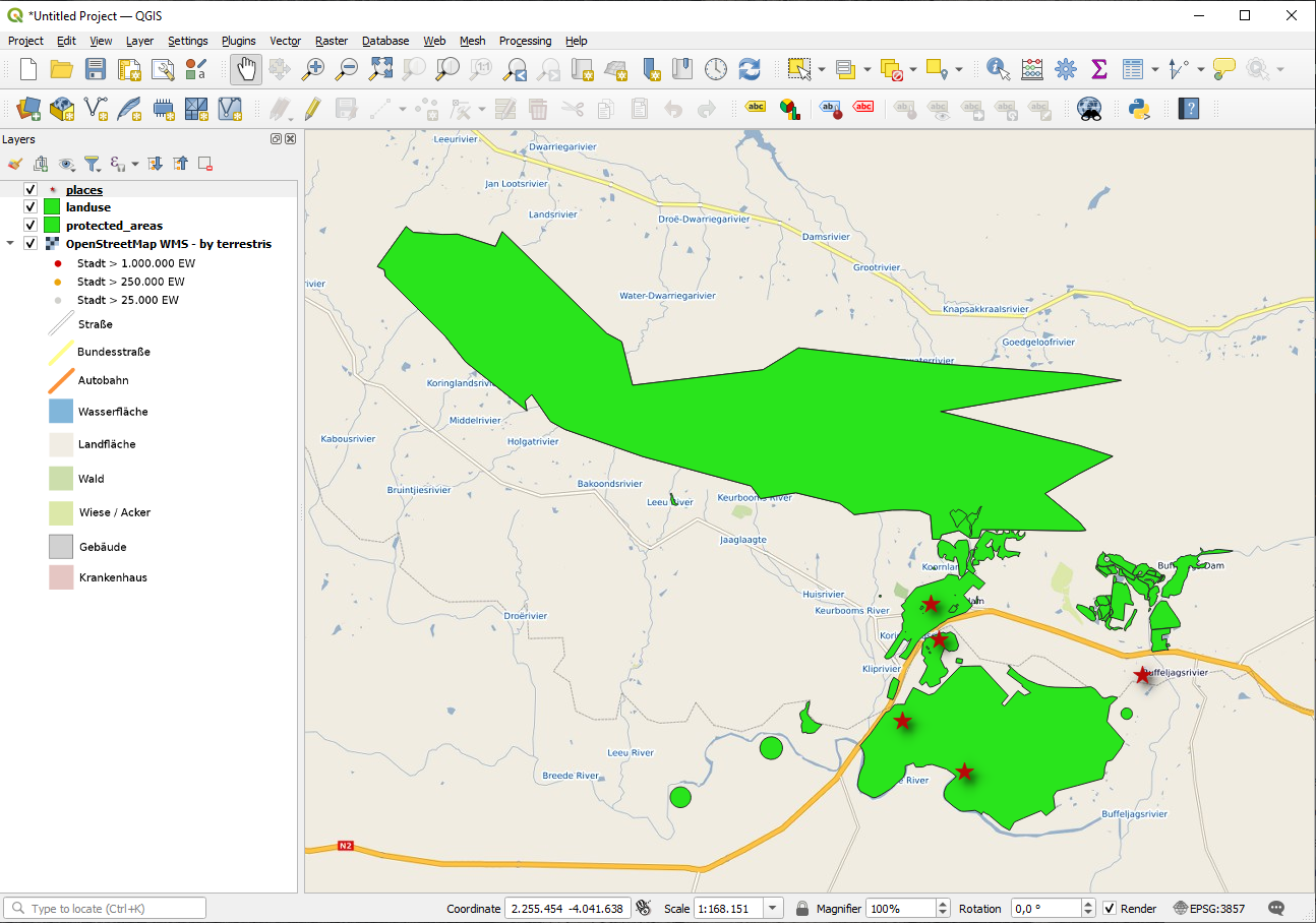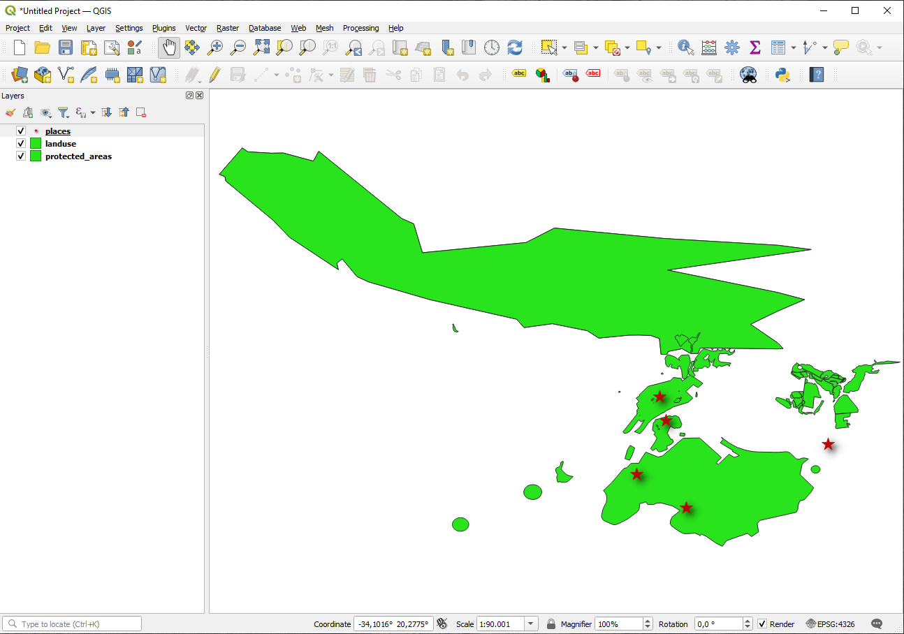 Для выполнения данного упражнения вы можете использовать либо базовую карту, которую вы создали в начале курса, или же просто создать новую карту и загрузить в нее некоторые существующие слои. В приведенном примере мы использовали новую карту и загрузили исходные слои places, landuse и protected_areas и скорректировали условные обозначения: