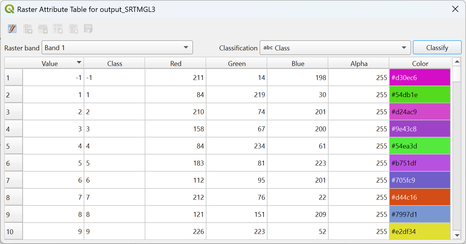 When set, a raster attribute table can be accessed from the Attribute tables tab of the layer properties dialog or by selecting Open raster attribute table from the layer contextual menu in Layers panel. This dialog shows a table whose rows correspond to the different pixel values or value ranges classified in a given band of the raster layer. Depending on the type of classification, a row is described by: