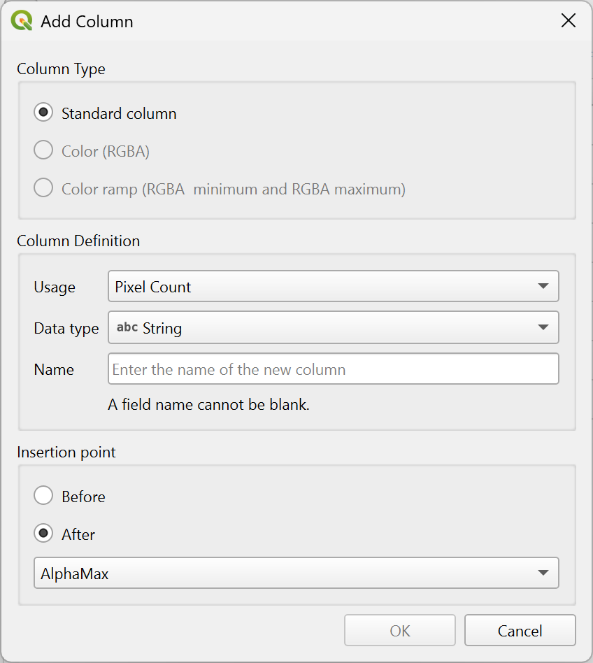 column to the raster attribute table. The dialog lets you define:Column Type, which can be: