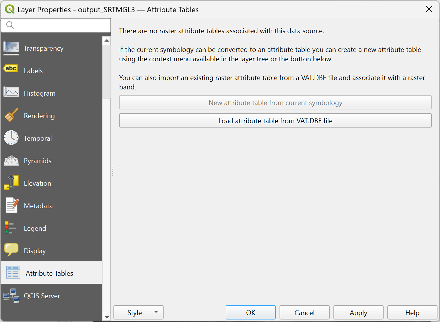 Load attribute table from VAT.DBF file: retrieves the attribute table from an external DBF file. Load Raster Attribute Table dialog will appear to let you browse and select the DBF file and associate it with the raster band. The action also can be done by right-clicking the raster layer in the layers panel and selecting